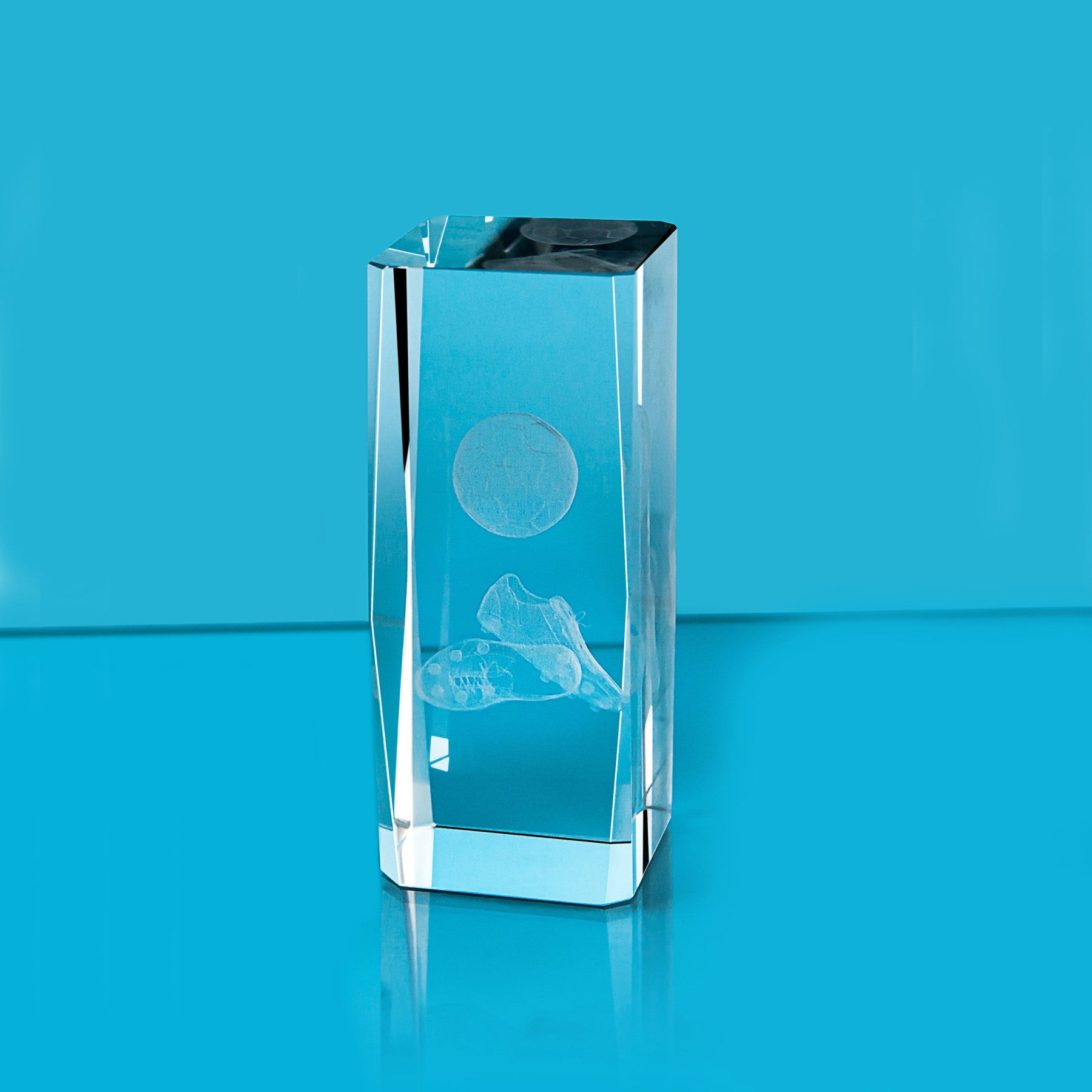 Photos honestly don’t do these justice. These are solid glass football trophies with a boot and ball image laser engraved inside the glass. Available in three sizes, each award can also include an engraving plate that attaches neatly to the front bottom edge. Size options are 8cm, 10cm, 12cm and 14cm.