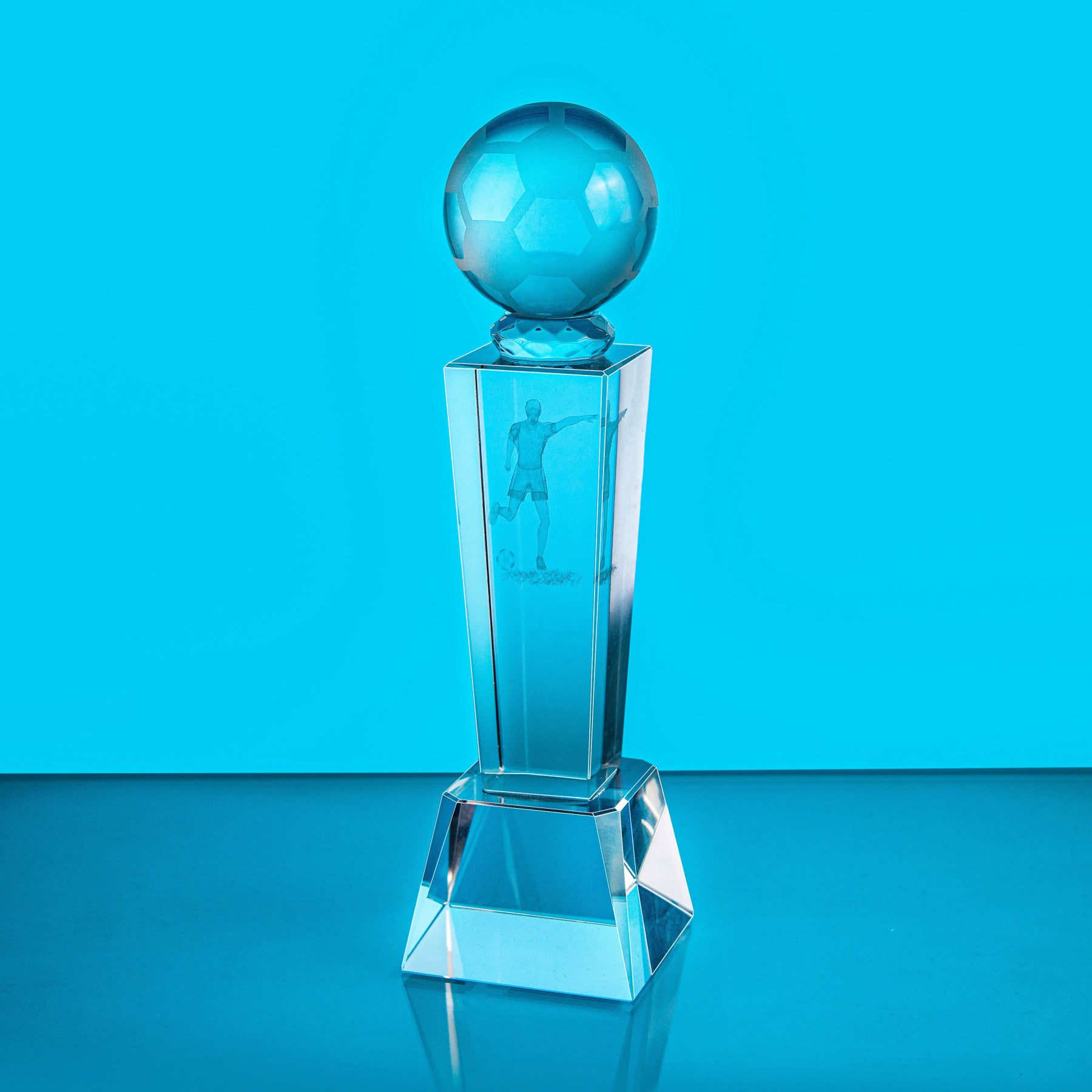 A striking glass Football Award topped with a finely detailed football. Inside the column is a superb 3D laser engraved footballer in action. Available in three sizes to suit any level of achievement. Includes a free presentation box. Size options are 17.5cm, 20cm and 24cm.