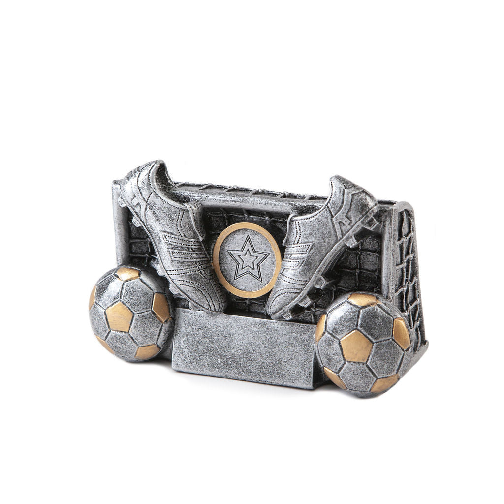 An eye-catching Double Boot and Ball Goal Trophy featuring two detailed silver football boots and goal. The space between the boots allows you to add your team logo or bespoke design. The base includes a polished plate for engraving so you can mark a name, moment or message forever. A premium, customisable award that celebrates the passion, teamwork and success of football.